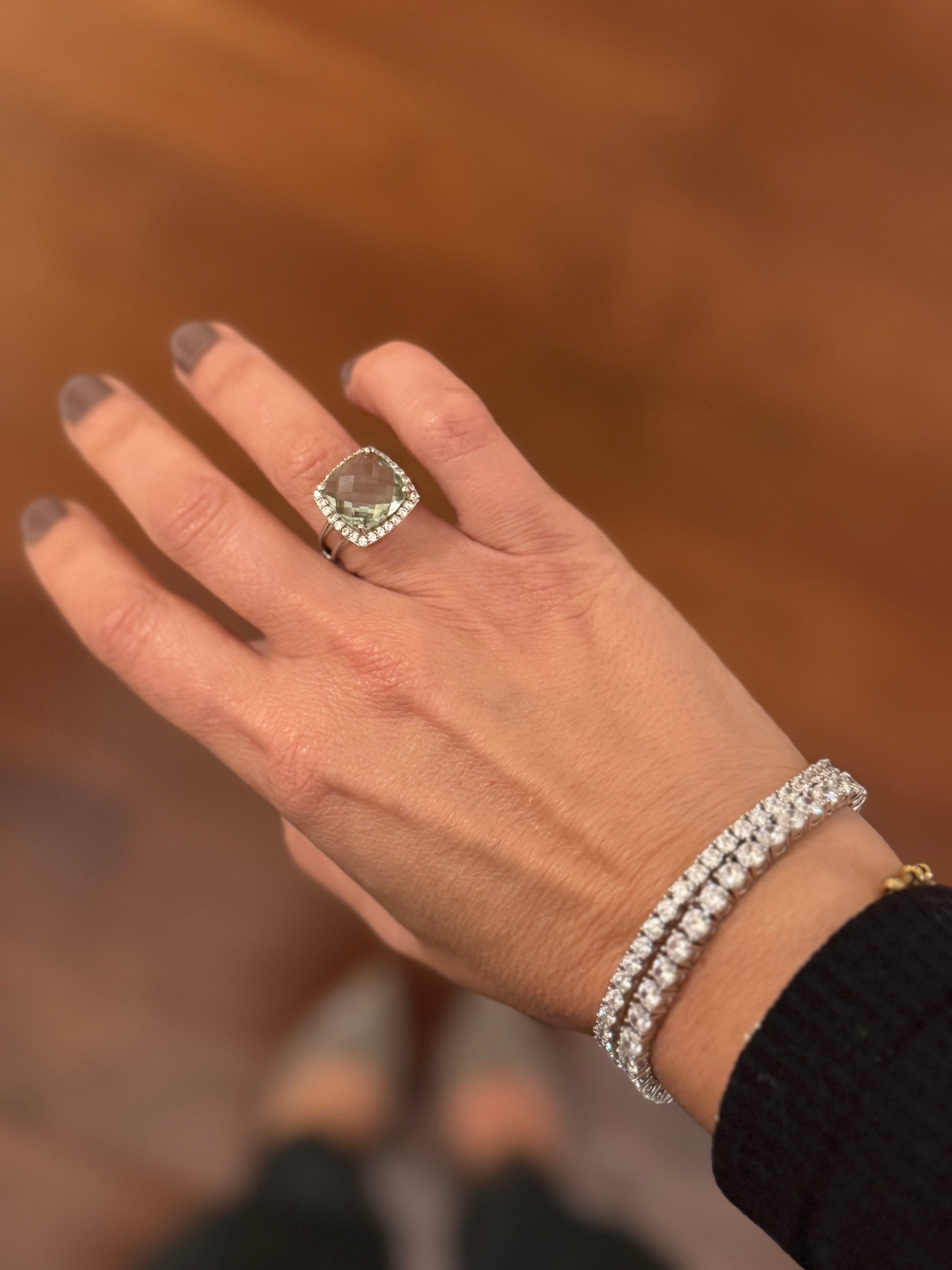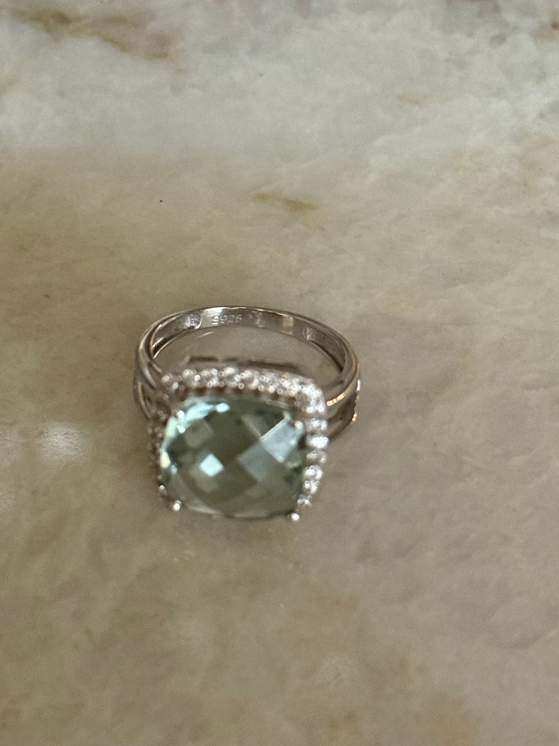 - Stone: Green amethyst (faceted)