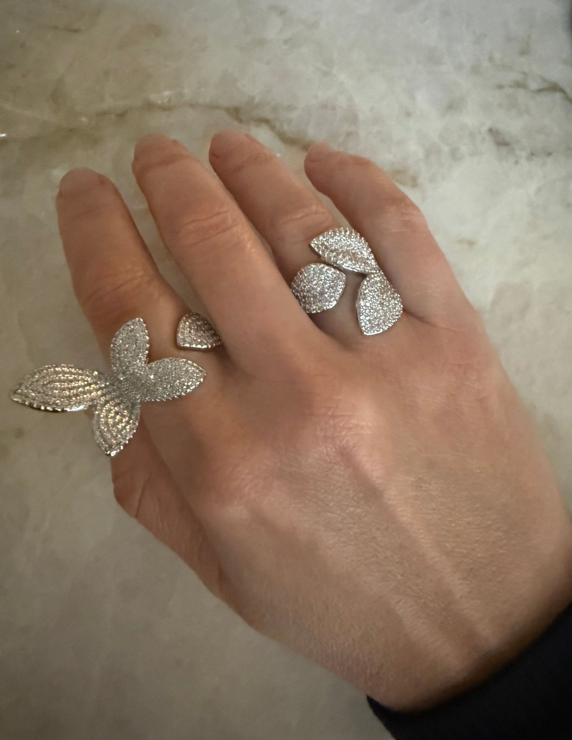 The set includes a pair of elegant earrings with a modern, asymmetrical flower design, and a matching adjustable ring that fits comfortably on any finger. Each piece reflects a perfect balance of grace and edge, designed to stand out whether worn together or separately.