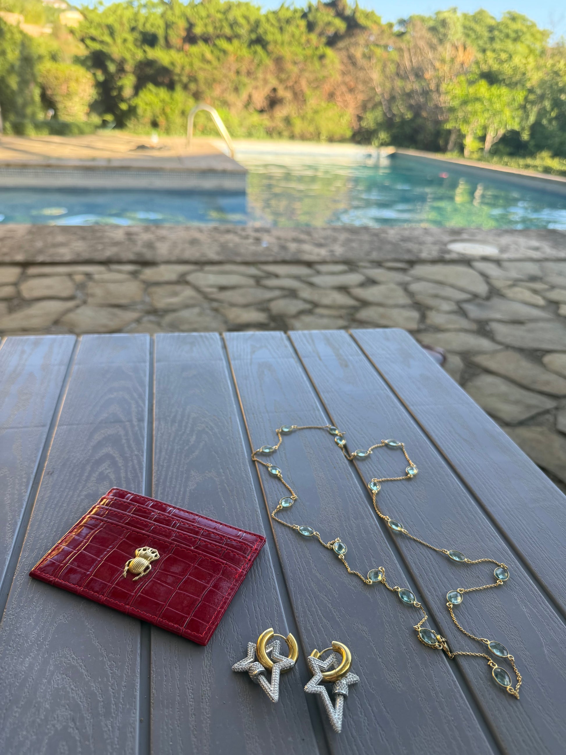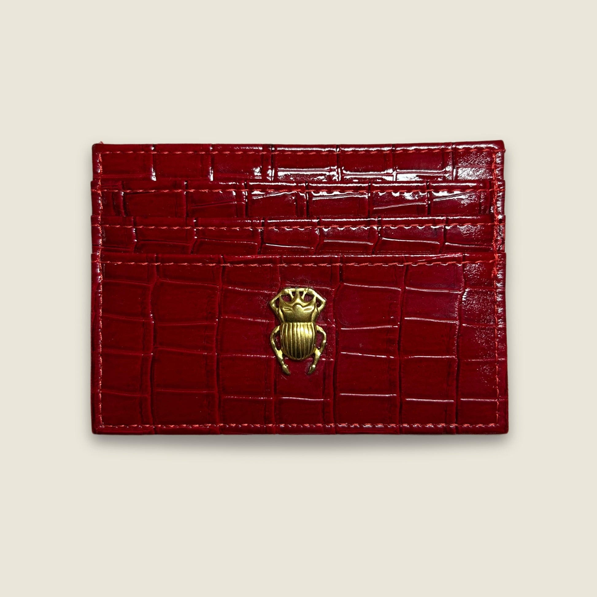 Elevate your essentials with this sleek and stylish card holder featuring a unique golden beetle detail on the front. It includes three card slots on the front, one on the back, and a central slit perfect for bills or extra cards. Its slim design fits perfectly inside clutches and bags, adding a touch of practicality and elegance to your everyday carry.