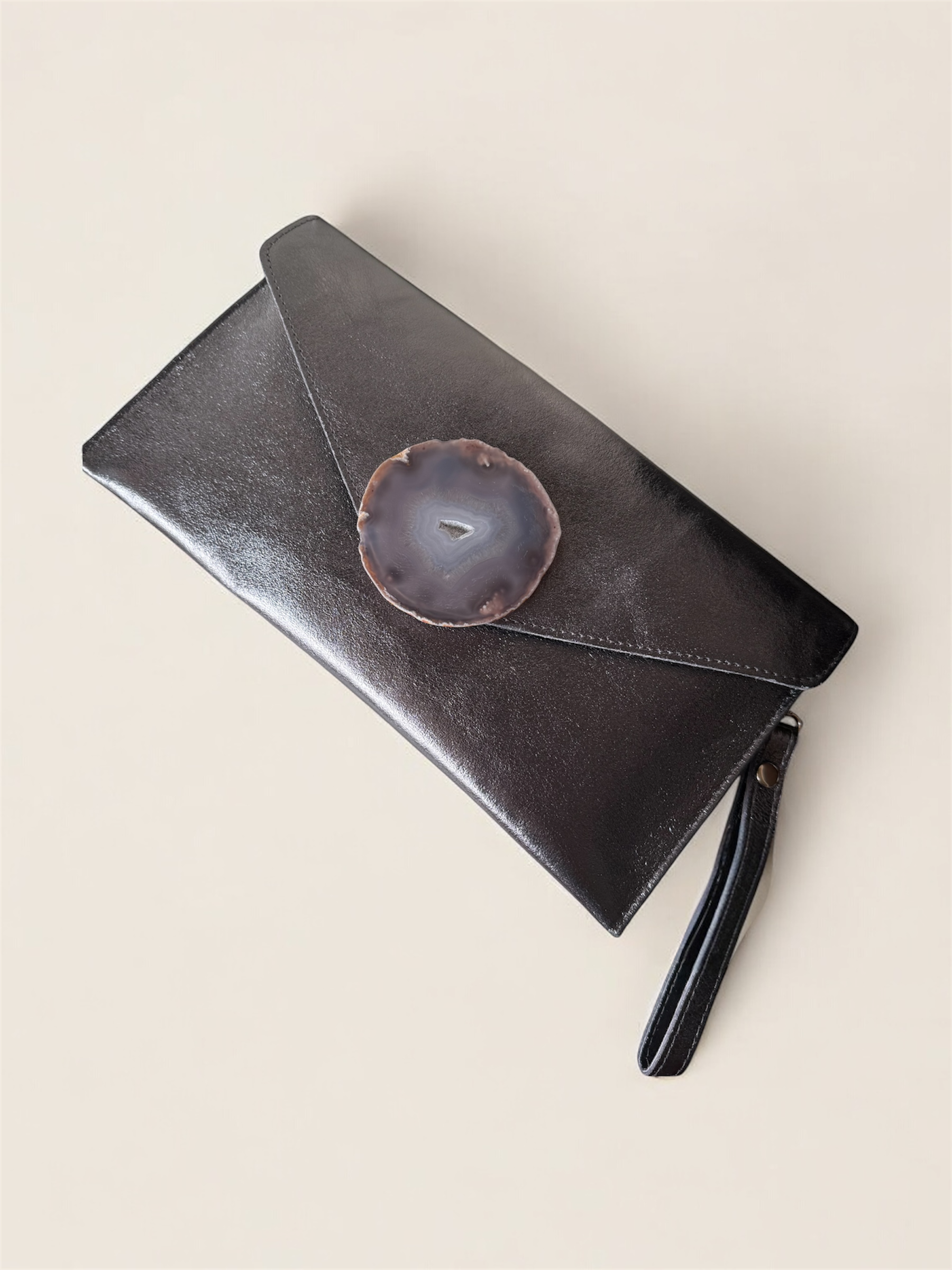 A statement piece that blends nature and sophistication. Handcrafted from genuine leather, this clutch features a stunning natural geode that makes each piece truly one of a kind. Perfect for evening events or to elevate your everyday style where elegance meets the beauty of the earth.