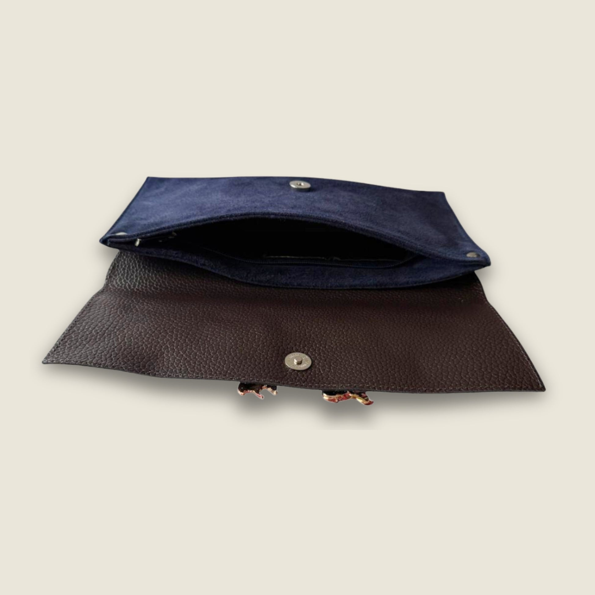 Make a bold statement with this clutch bag, crafted in genuine leather with a sophisticated deep blue tone. Designed with versatility in mind, it includes both a detachable leather crossbody strap and a wristlet strap for multiple styling options.