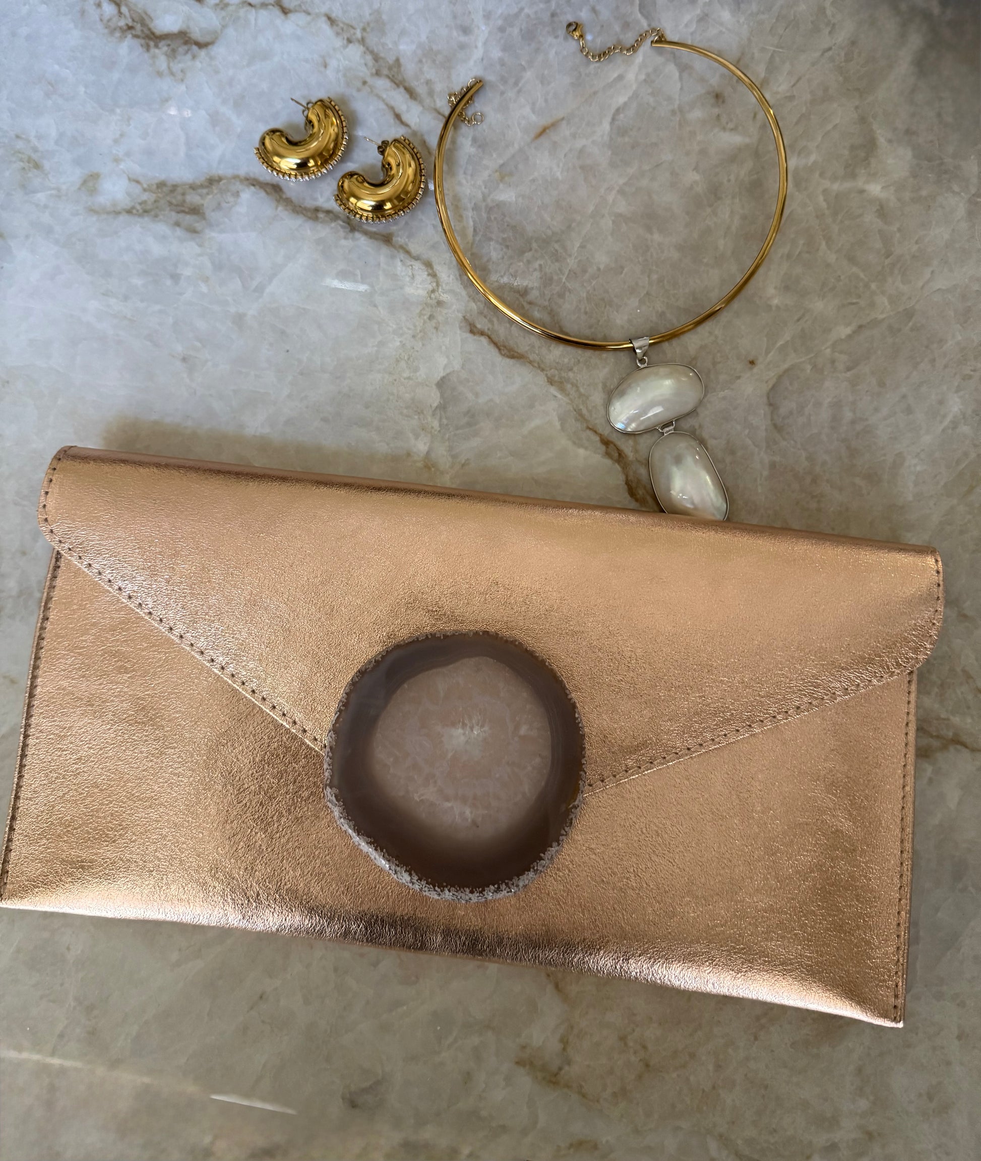 A versatile statement piece crafted in genuine metallic leather, this envelope-style bag features a striking natural geode accent that adds a unique, earthy touch. Designed for flexibility, it can be worn as a wrist clutch or as a crossbody with the detachable strap. Perfect for day or night, it effortlessly blends elegance with artisanal charm.