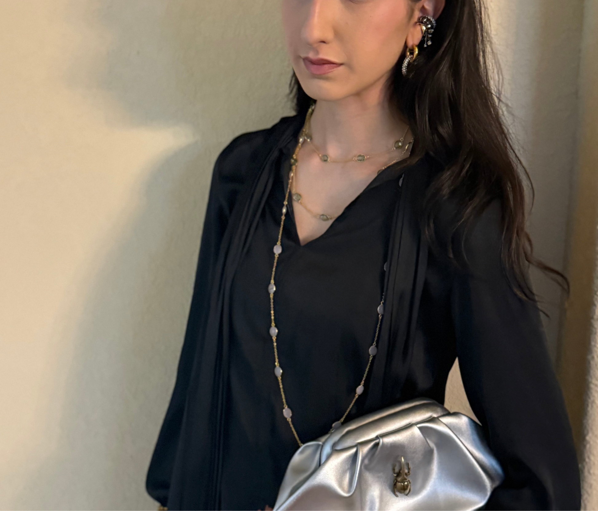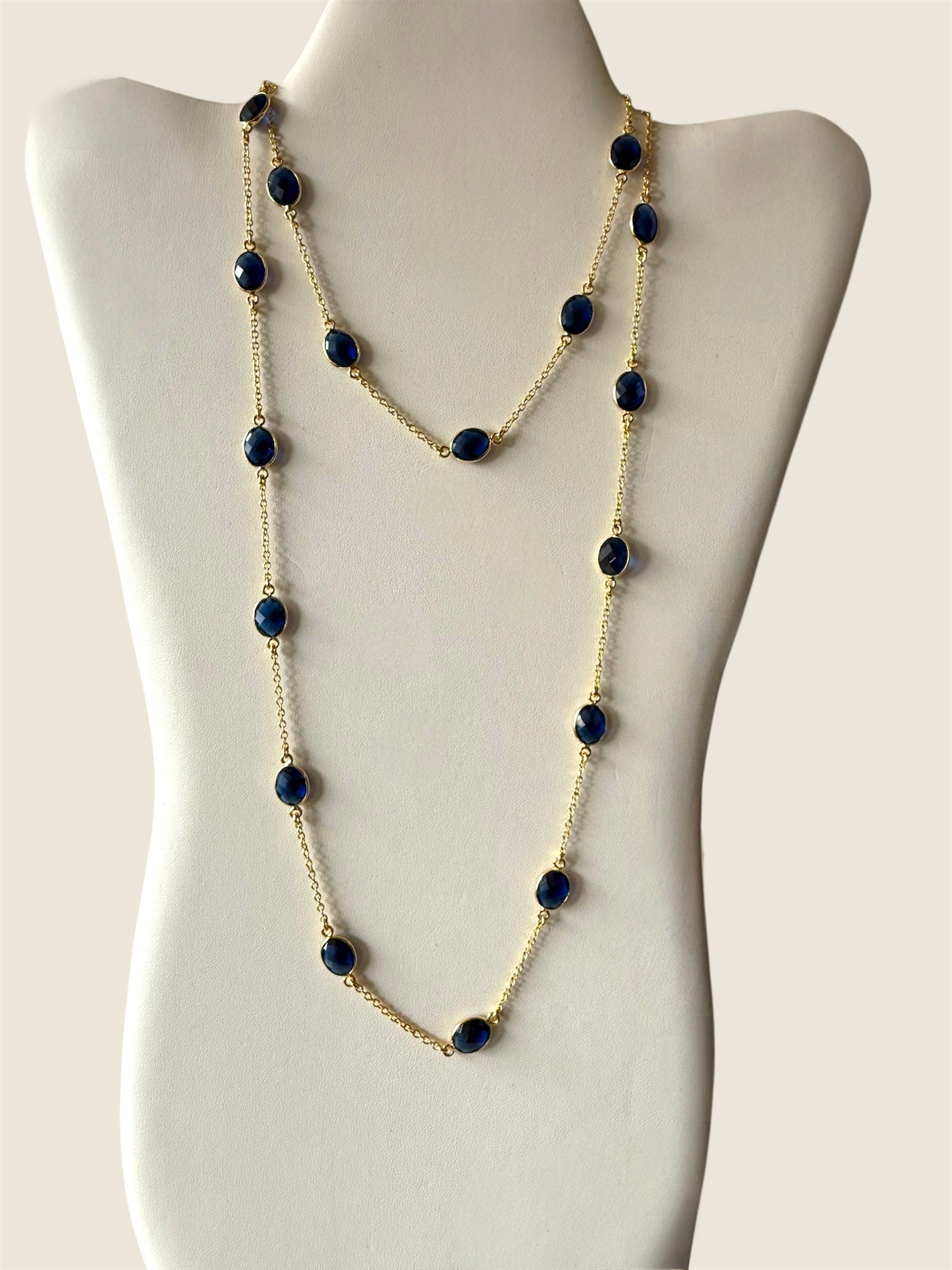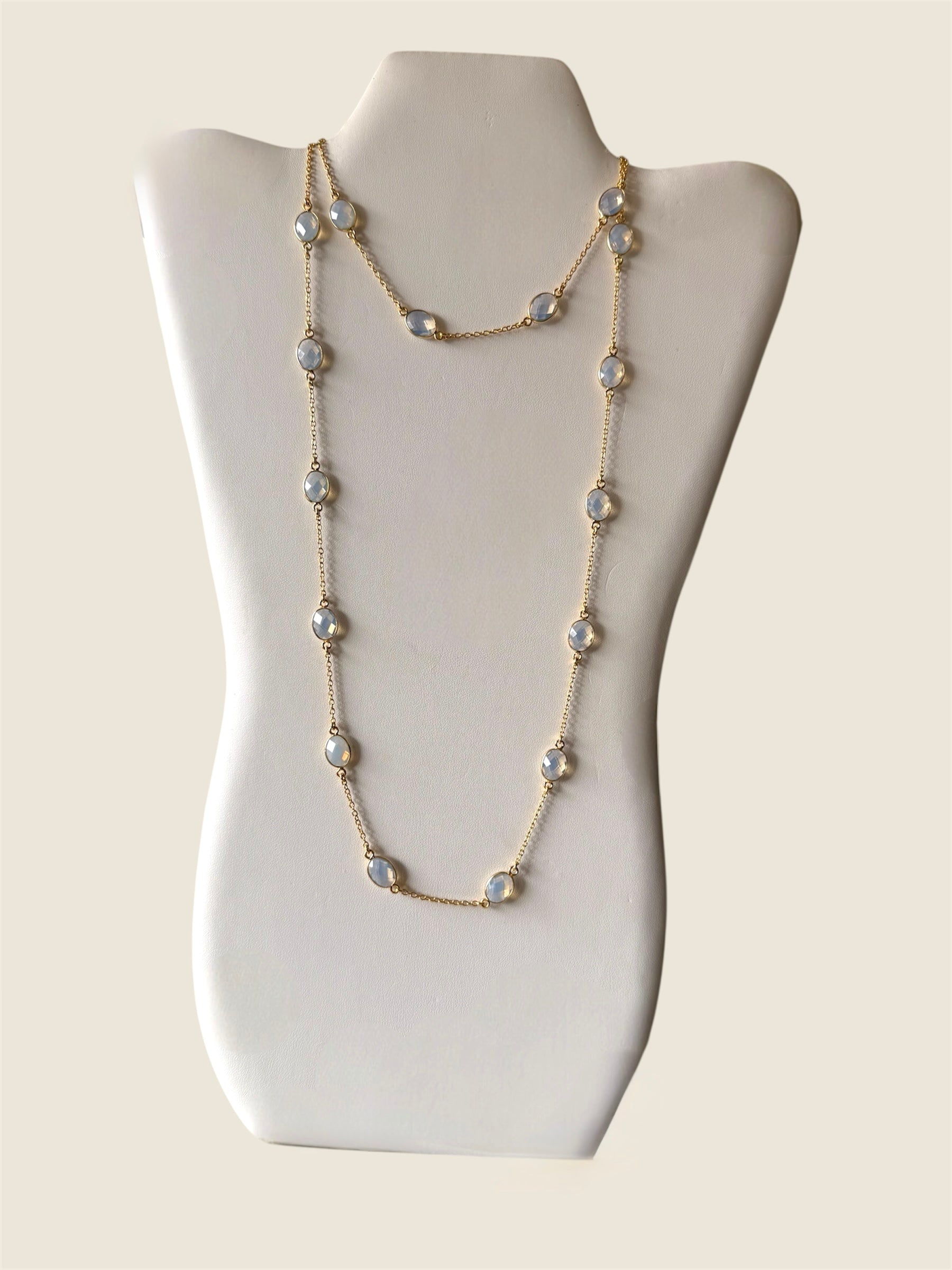 Elegant long quartz necklace featuring a versatile design that can be worn as a single statement strand or doubled for a layered look. The natural quartz catches the light beautifully, adding a touch of sophistication to any outfit.