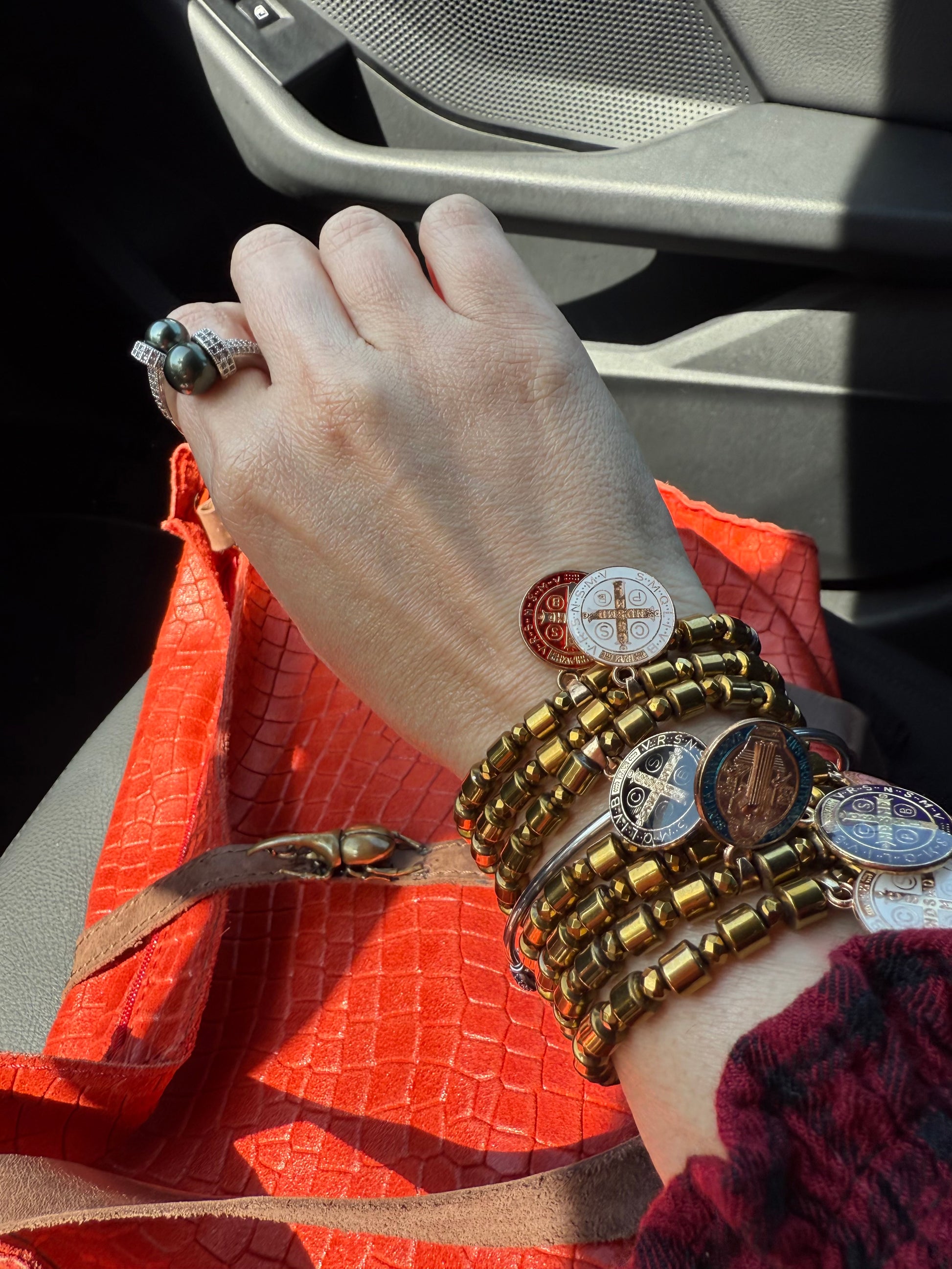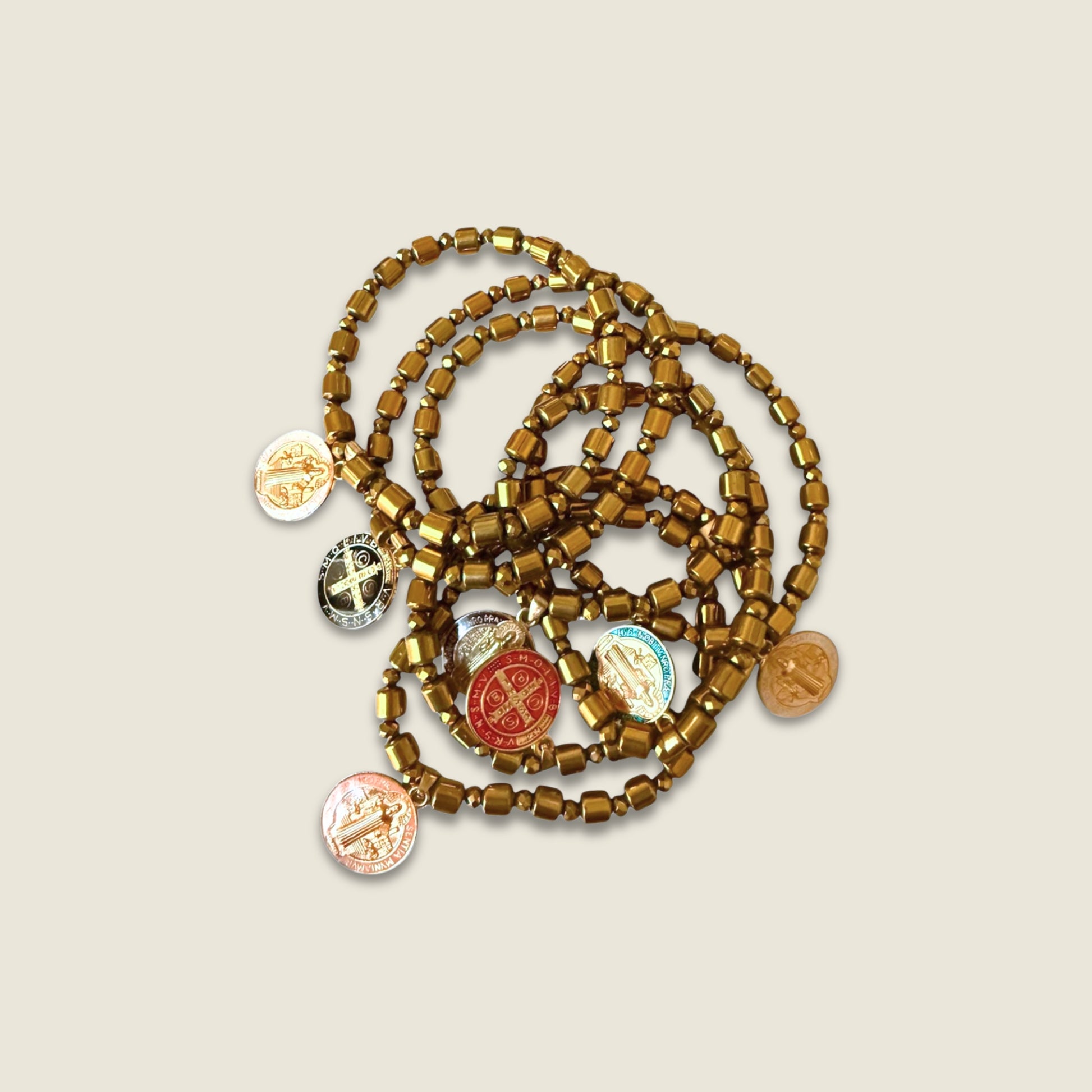 This beautiful set includes 7 elastic bracelets made with polished natural hematite beads and mixed-color St. Benedict charms.