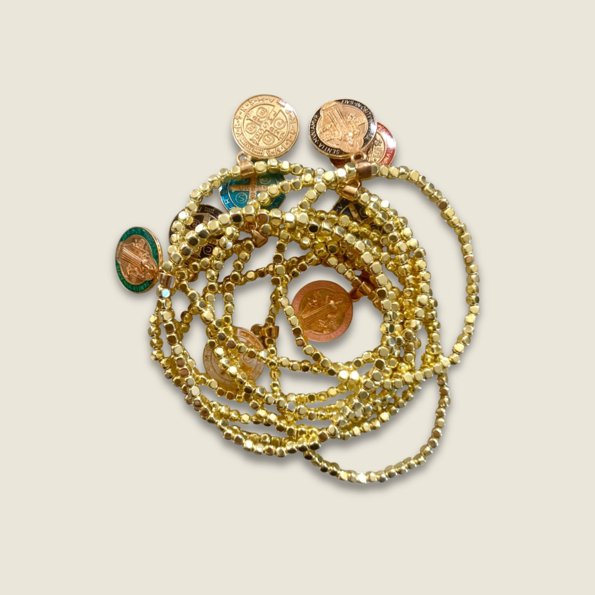 This beautiful set includes 7 elastic bracelets made with polished hematite beads and mixed-color St. Benedict charms.
