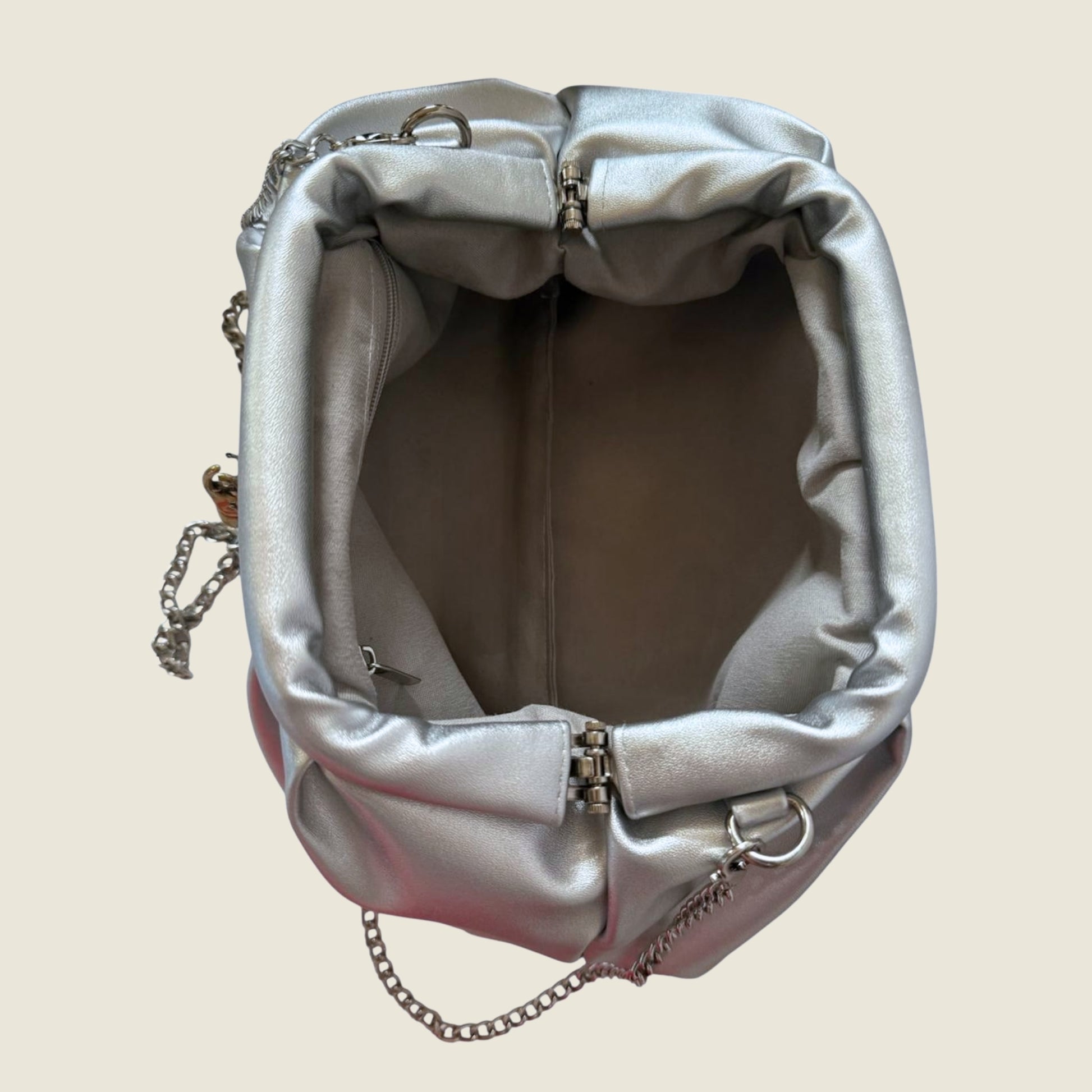 Versatile and elegant, this clutch features a detachable silver chain, allowing you to wear it as a stylish crossbody or carry it by hand for a classic clutch look.