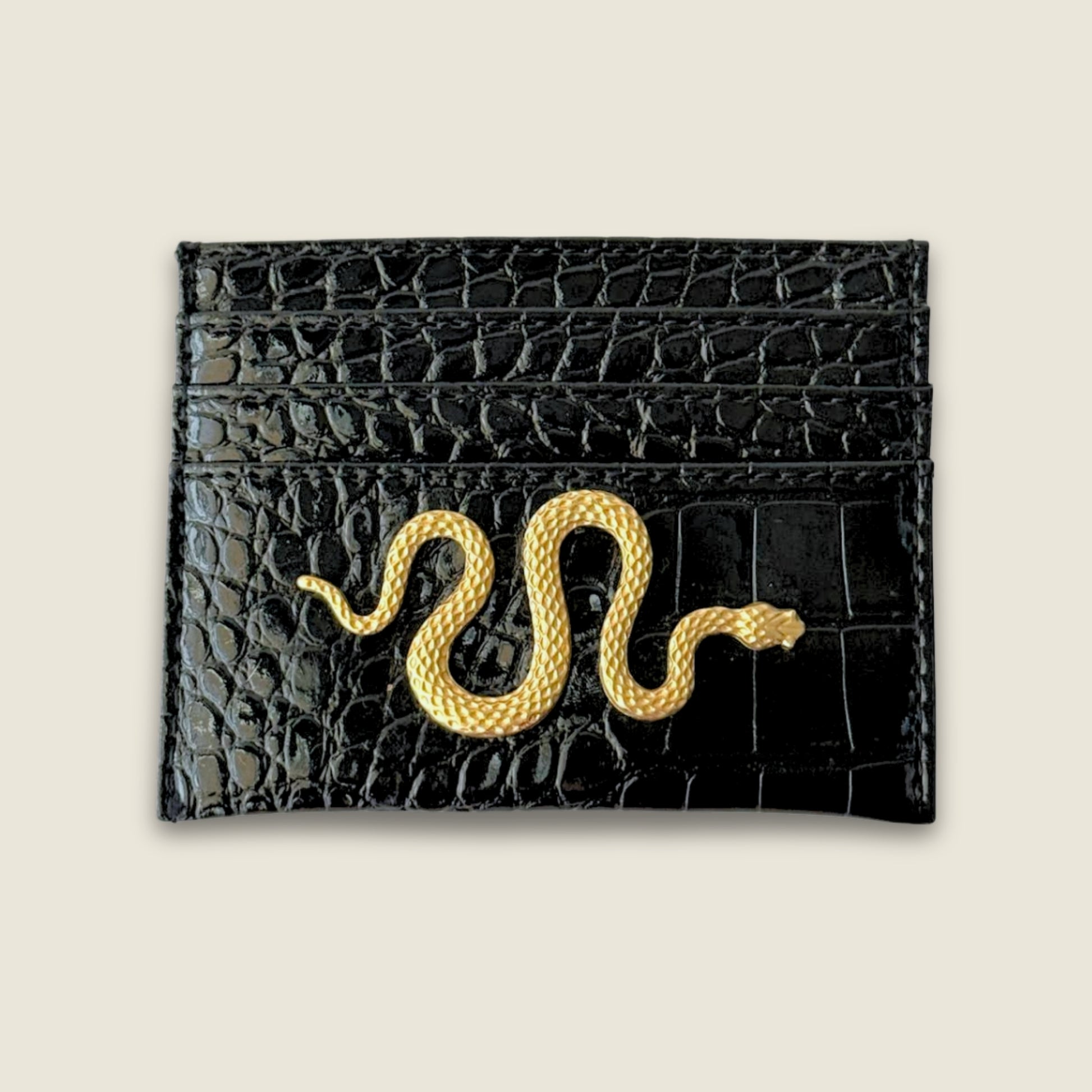Elevate your essentials with this sleek and stylish card holder featuring a unique golden snake detail on the front. It includes three card slots on the front, one on the back, and a central slit perfect for bills or extra cards. Its slim design fits perfectly inside clutches and bags, adding a touch of practicality and elegance to your everyday carry.