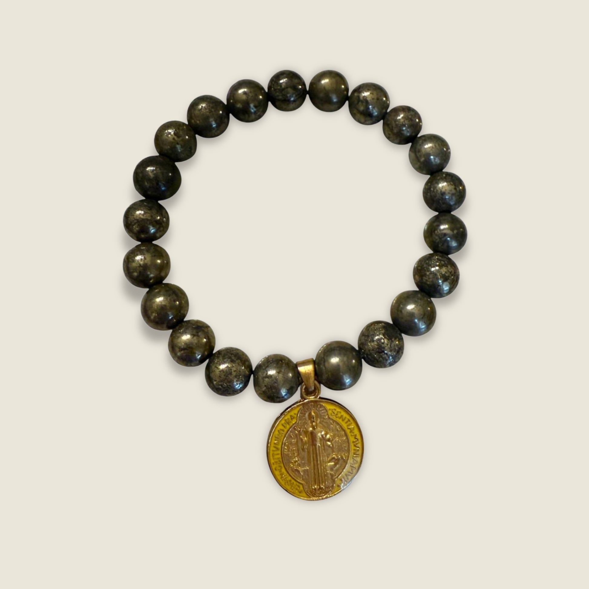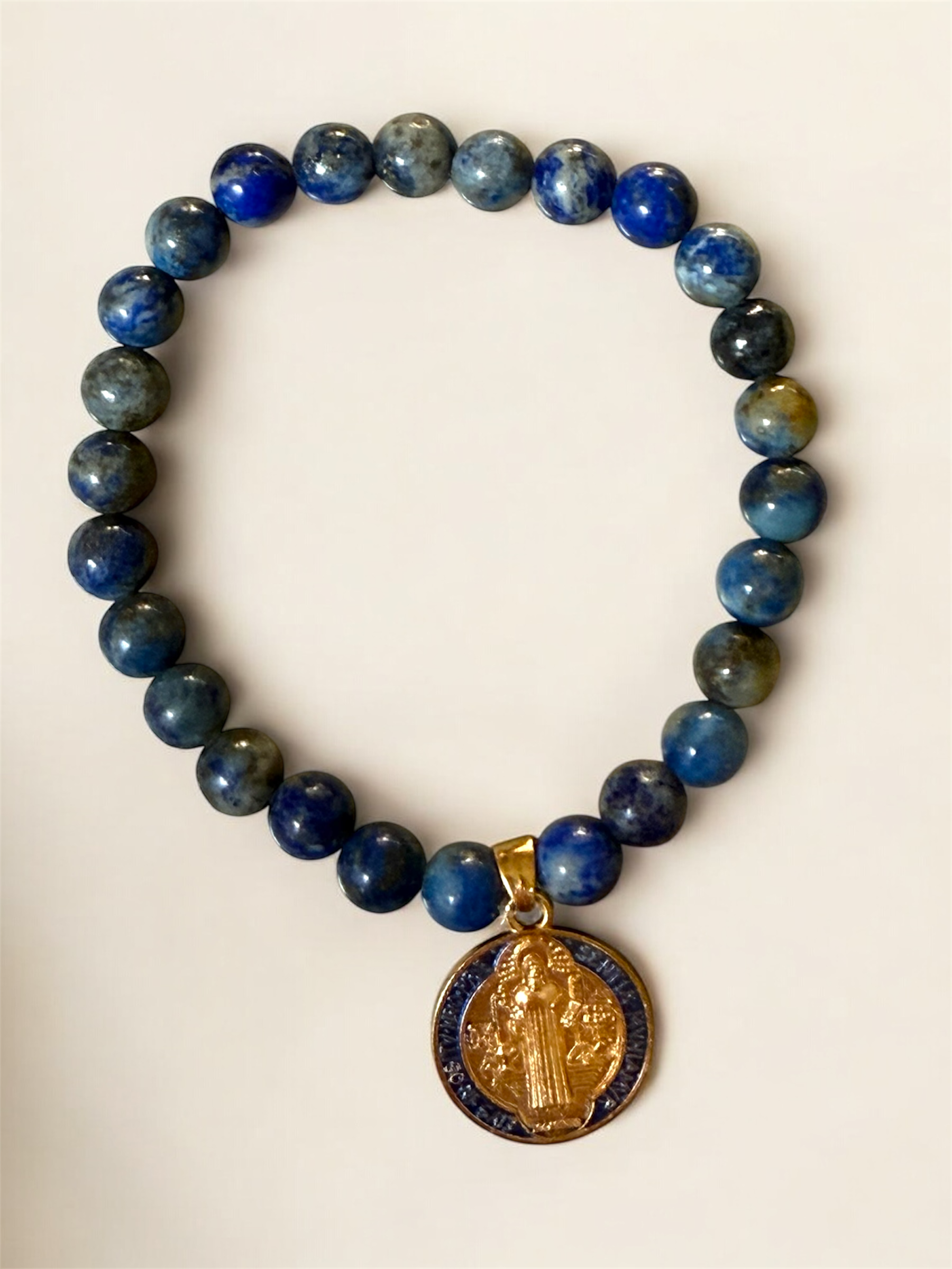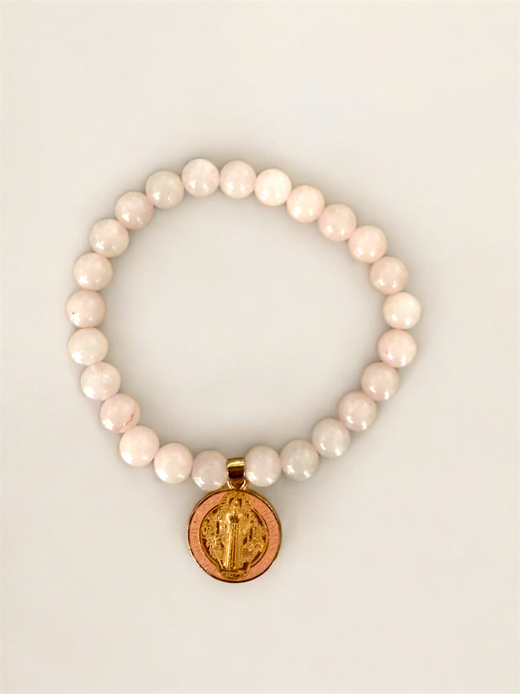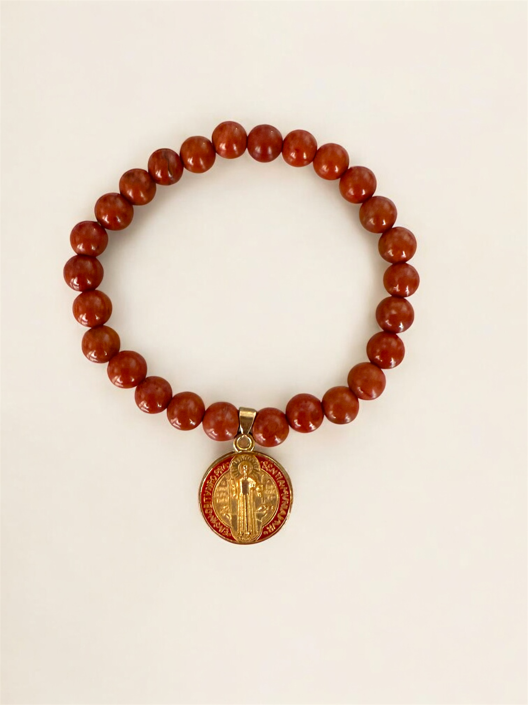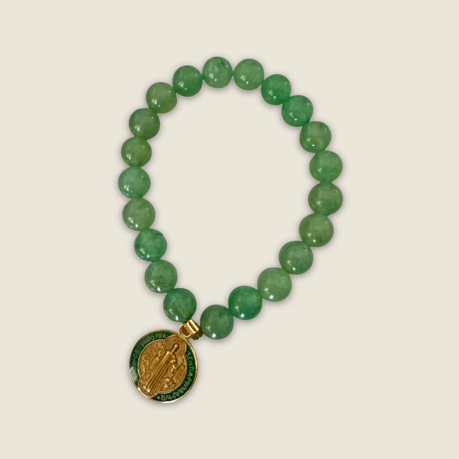 Elastic bracelet with natural semiprecious stones and St. Benedict charm a symbol of faith and protection. Stack it or wear it solo for a subtle statement.